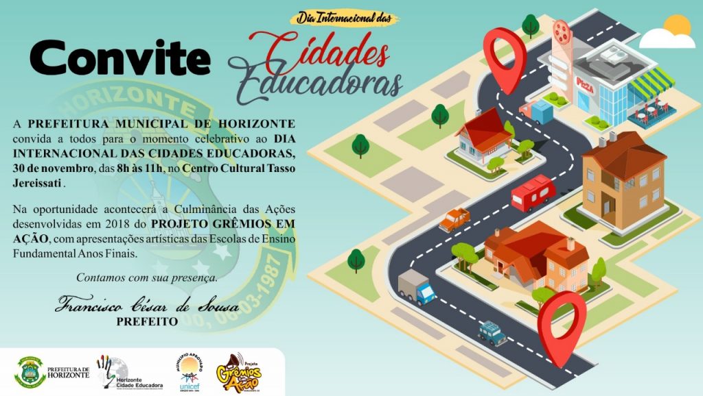 No dia 30 é comemorado o Dia Internacional das Cidades Educadoras. O município de Horizonte integra a AICE Associação Internacional das Cidades Educadoras. A cidade educadora converte todos seus espaços em locais educativos. Trata-se de uma proposta intersetorial, que transcende a sala de aula, e soma a atuação de todas as partes (saúde, educação, cultura, meio ambiente, comunidade, empresas, etc).