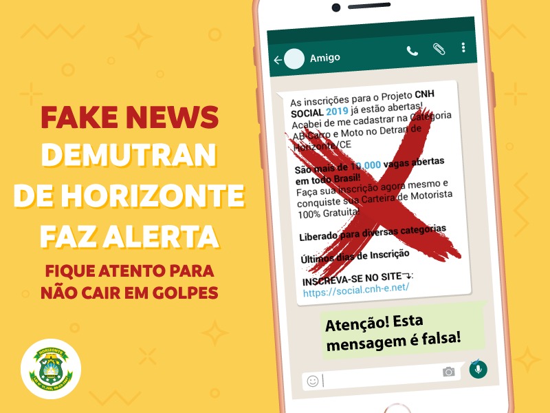 O Departamento Municipal de Trânsito e Transporte de Horizonte (Demutran) informa que não procede a informação de inscrições abertas para o Projeto CNH Social 2019 para emissão gratuita da CNH. Trata-se de um boato que está circulando na internet. Pedimos para a população ficar atenta a este tipo de serviço para não cair em golpes, pois estes serviços devem constar nos sites oficiais das instituições responsáveis. A Prefeitura de Horizonte reforça seu compromisso com a verdade e repudia com veemência a propagação de notícias falsas como esta.