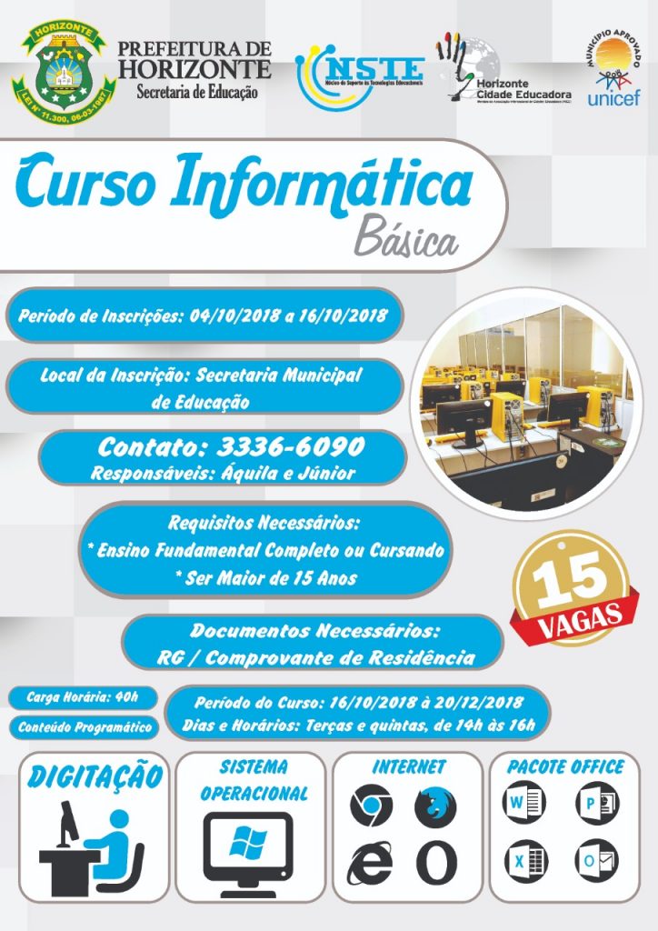 Estão abertas as inscrições para o Curso de Informática Básica no período de 04 de outubro a 16 de outubro. Ao todo serão 15 vagas totalizando 40h.Confira mais informações abaixo.