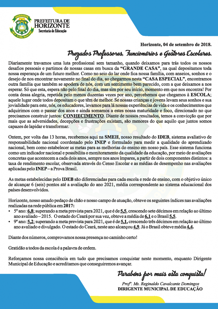 Dirigente de educação do município, Reginaldo Cavalcante, divulga carta sobre o desempenho de Horizonte no IDEB 2017