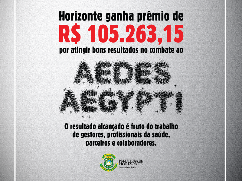 Os bons resultados atingidos no combate ao mosquito aedes aegypti renderam uma premiação para Horizonte no valor de R$ 105.263,15. O município registrou queda de 90% nos casos de dengue e de 98% nos de chikungunya. O incentivo é dado pelo Governo do Estado do Ceará aos municípios que atenderem os critérios para melhorar resultados no enfrentamento ao Aedes aegypti e as arboviroses (dengue, zika e chikungunya). O estímulo às gestões municipais nas ações de enfrentamento ao mosquito, a redução da incidência das arboviroses, a prevenção à ocorrência de casos graves e a ampliação da cobertura de visita domiciliar para melhorar a qualidade dos dados de infestação vetorial estão entre os objetivos do governo com essa ação. O recurso da premiação será destinado a ações preventivas contínuas de combate às arbovirores, promovendo mais saúde para os horizontinos.