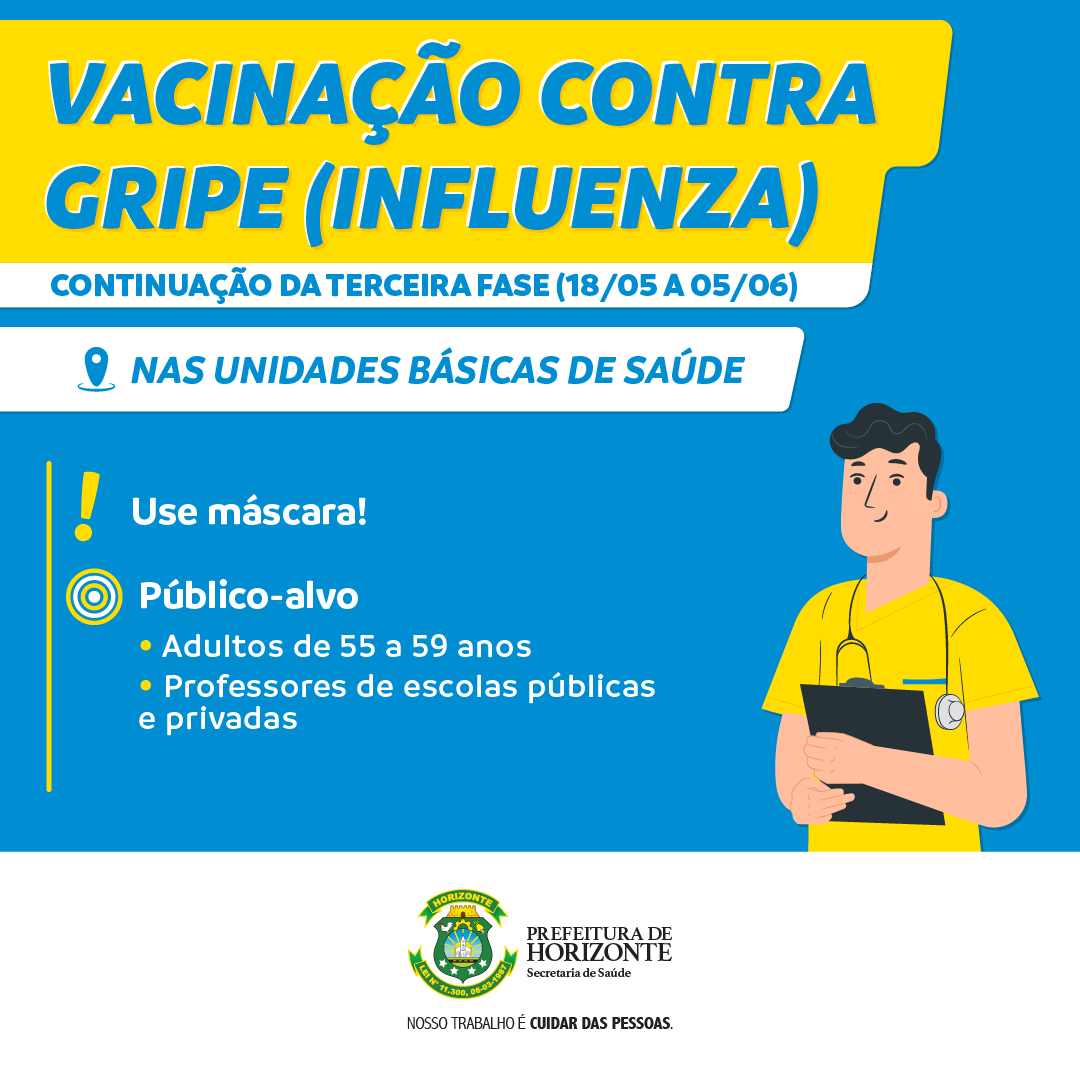 De 18 de maio a 5 de junho, adultos de 55 a 59 anos e professores de escolas públicas e privadas são o grupo prioritário para vacinação contra a gripe (Influenza) nas Unidades Básicas de Saúde em Horizonte. Quem se enquadra neste grupo deve se dirigir até uma UBS tendo em mãos RG, cartão do SUS e caderneta de vacinação.